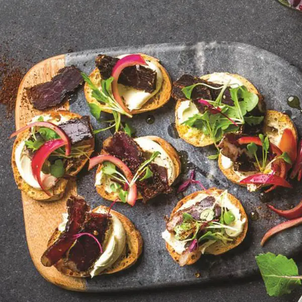 Makes 24 Ingredients1 French loaf¼ cup olive oilSalt and pepper1 cup cream cheese1 clove garlic, crushedJuice of half a lemon150g blue cheese2 tablespoons chopped chives (optional)125g onion marmalade180g J&M Sliced BiltongMicro Herbs and pickled onion for garnish Method Preheat the oven to 180C. Slice the french loaf into thin slices and lay flat on a […]